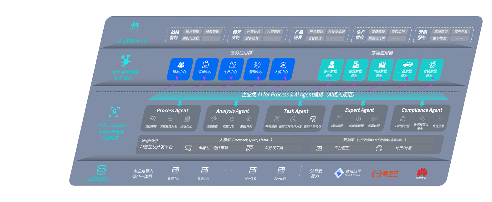 端到端的一站式AI工作空间深度融合了从企业战略规划到日常经营的全流程业务板块,,,定向解决车企内部领域多、、、、部门多、、链条长、、、、场景碎片化等难题,,,,支持车企快速构建以AI为核心的生产力写作体系,,,实现任务执行与AI能力的无缝集成与交互