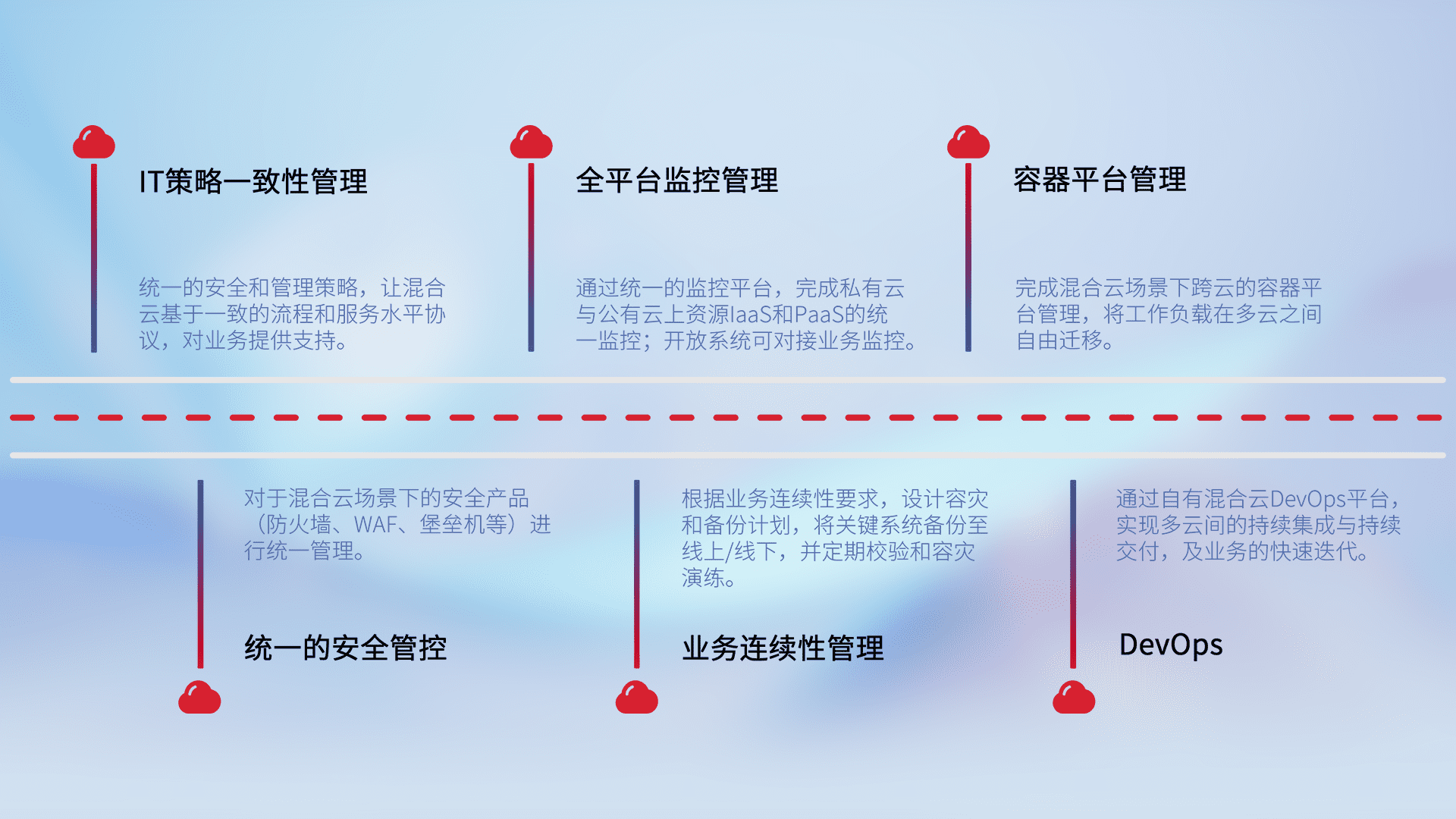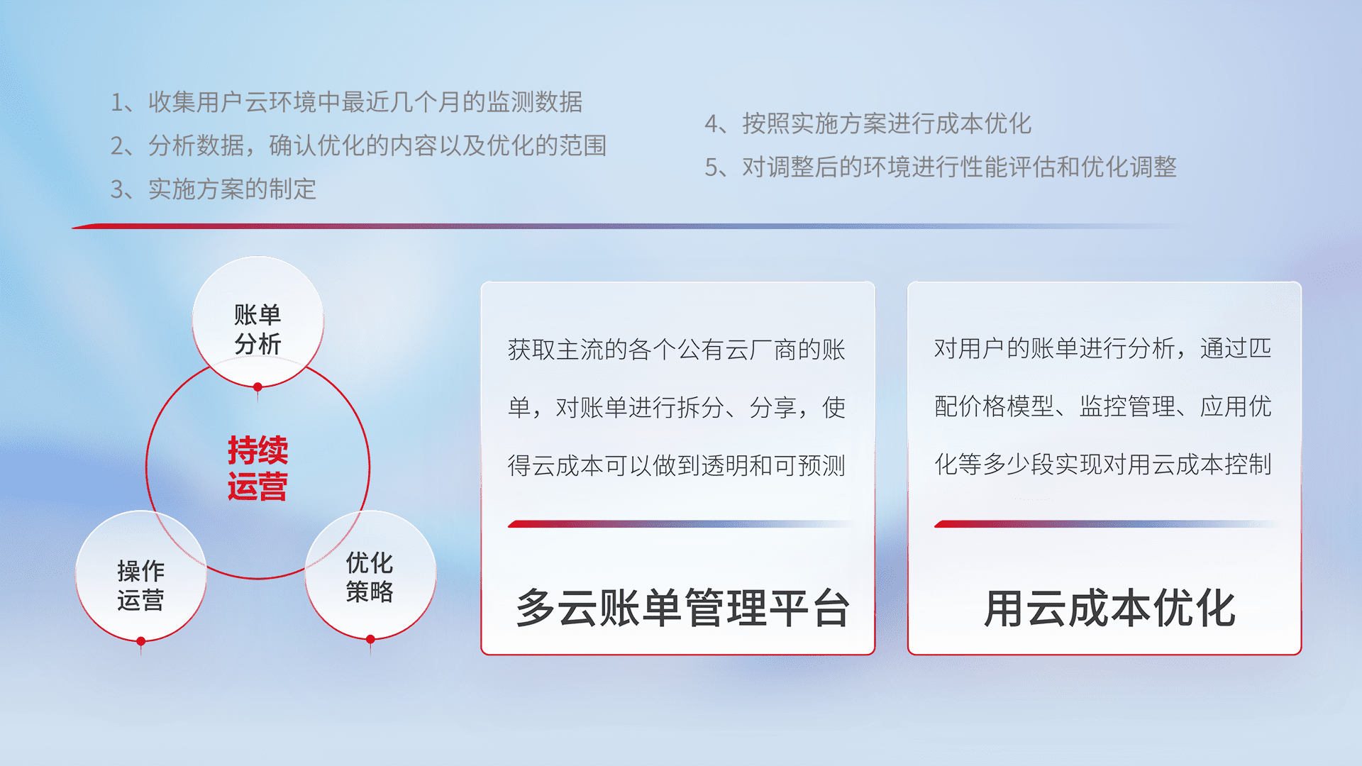 通过多云纳管,,,以统一的资源数据模型把客户的云资源进行抽象和封装,,,进而实现对多云资源的统一操作,,,保障云资源管理的可靠性、、稳定性与可用性。。。量身定制化运维内容,,,,配置、、、开发运维、、、补丁管理、、、、备份、、、、监控、、、、认证和访问管理、、、、审计和日常巡检等,,,,保障在用云过程中的可靠度,,稳定度以及高可用率。。