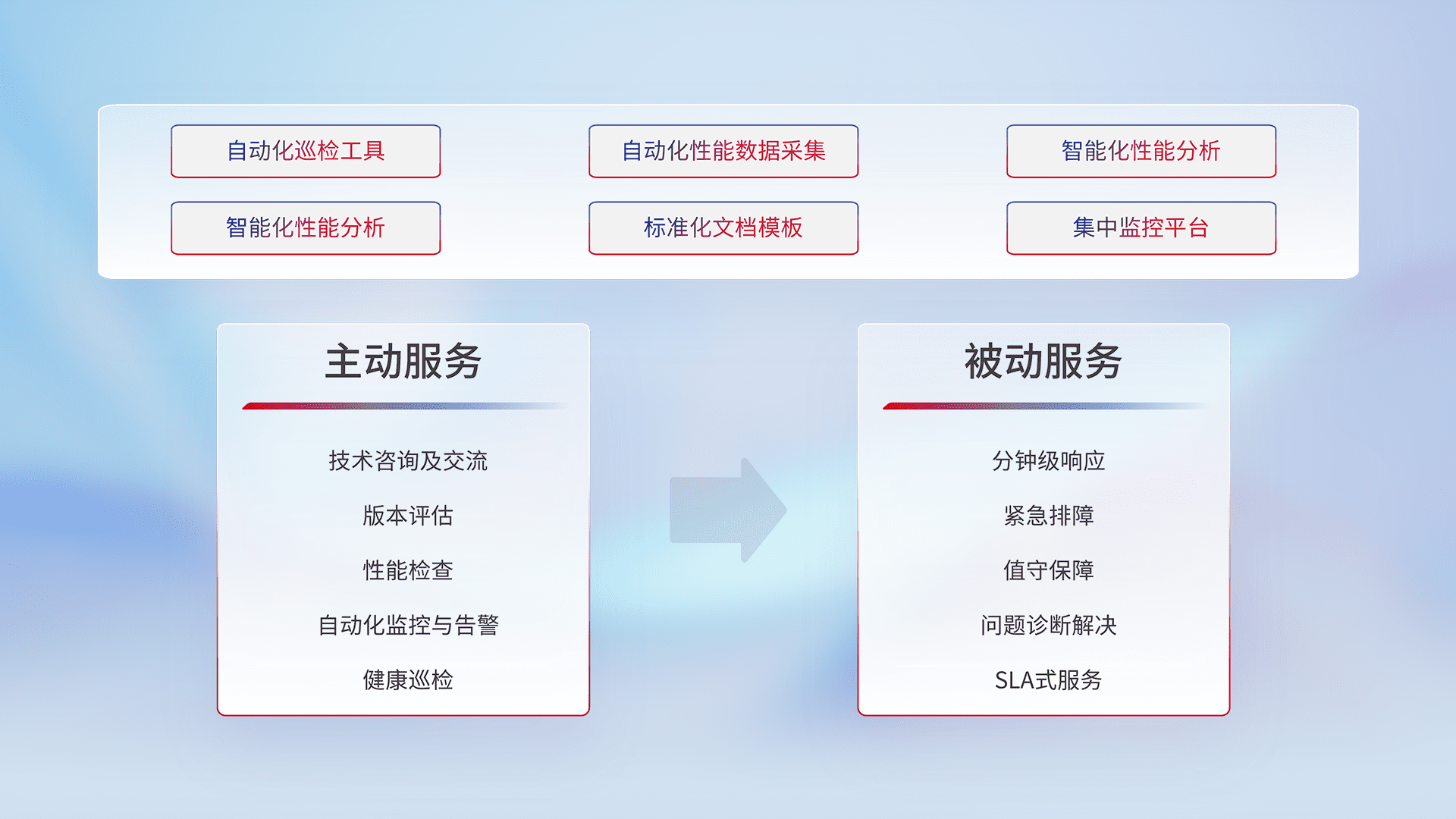 智能化工具和标准化文档,,,保障服务质量,,,,提供主动服务(包含技术咨询、、版本评估、、、性能检查、、、自动化监控与告警、、、、健康巡检)和被动服务包含(分钟级响应、、、紧急排障、、值守保障、、、问题诊断解决、、、、SLA服务)。。。