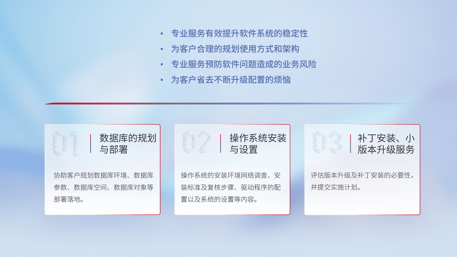 为客户提供软件规模升级、、、快速部署、、、、按需配置的专业服务,,,,从数据库的规划与部署到操作系统的安装与设置,,,,再到补丁安装和小版本升级提供支持。。。。