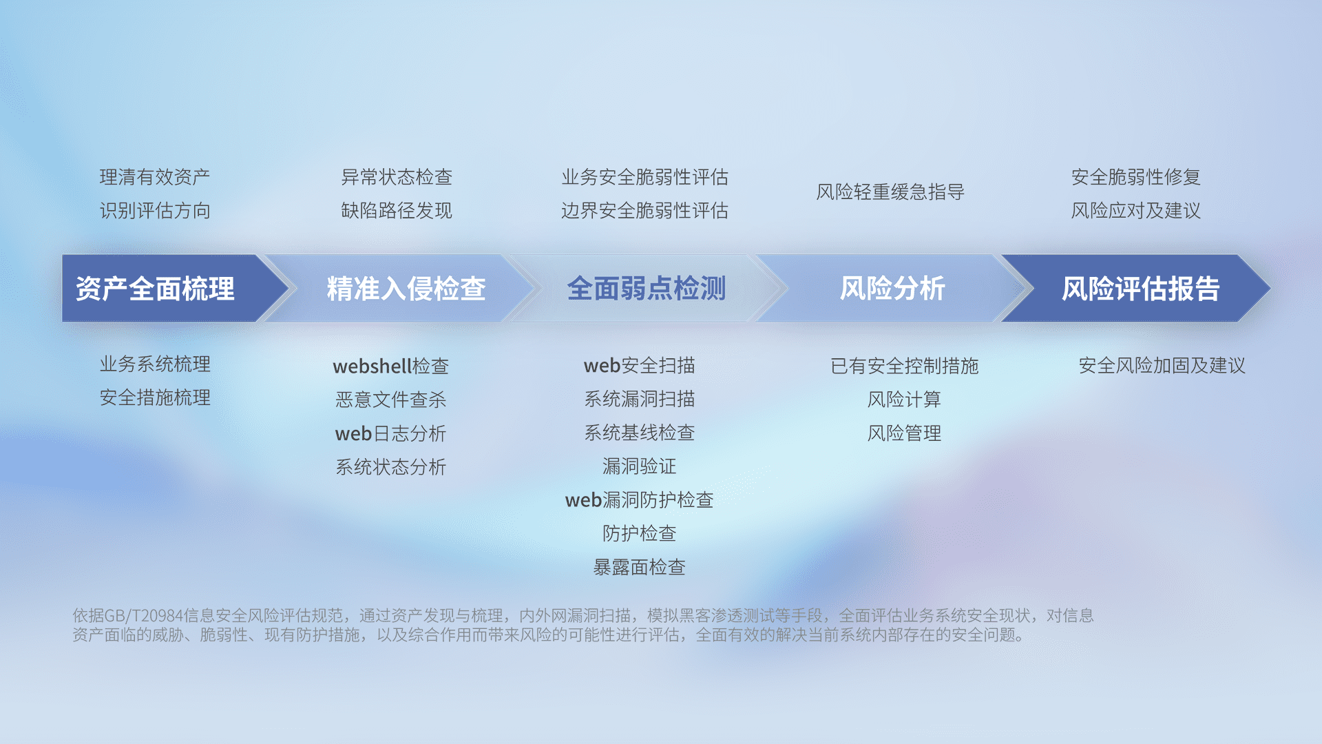 针对客户行业特性,,,,以专业的安全服务+多厂商联合解决方案提供专属的一站式安全管理服务,,,,帮助客户全面感知网络空间威胁,,基于识别、、、、检测、、、、分析、、、、防护、、监测、、、响应的服务理论模型,,,,从方案咨询、、、、集成交付、、、评估验证、、、优化加固、、、、运维运营,,,致力于为客户提供完整的闭环管理式安全服务。。以实战经验为客户打造高抵御风险的安全体系,,,,帮助客户发现威胁、、、对抗威胁、、、处置威胁,,不断积累安全对抗能力,,,持续保障数字化安全。。